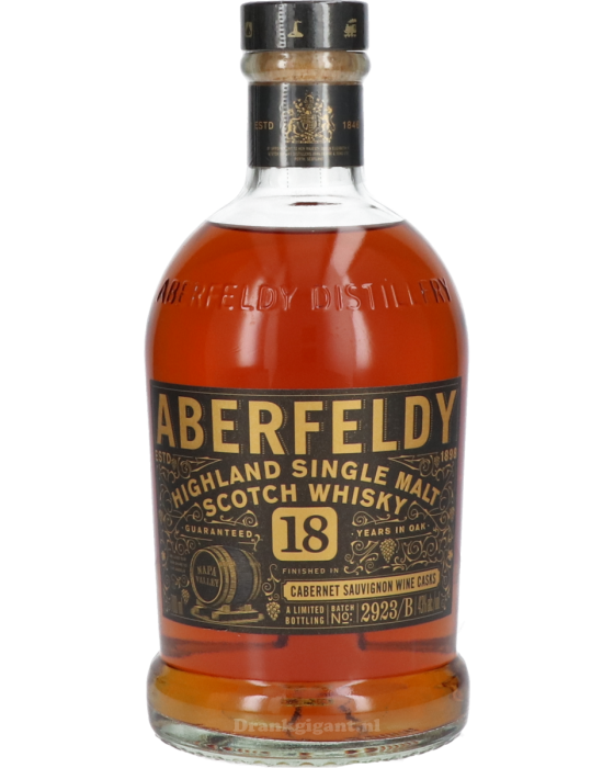 De Aberfeldy 18 Year Old Napa Valley Red Wine Cask is een verfijnde Highland single malt whisky die de kenmerkende honingzoete en fruitige tonen van Aberfeldy combineert met de rijke invloeden van Cabernet Sauvignon wijnvaten uit de Napa Valley, Californië. Deze speciale editie heeft 18 jaar gerijpt in een combinatie van refill en hogshead vaten, gevolgd door een finish van ongeveer 15 maanden in ex-Cabernet Sauvignon rode wijnvaten.
