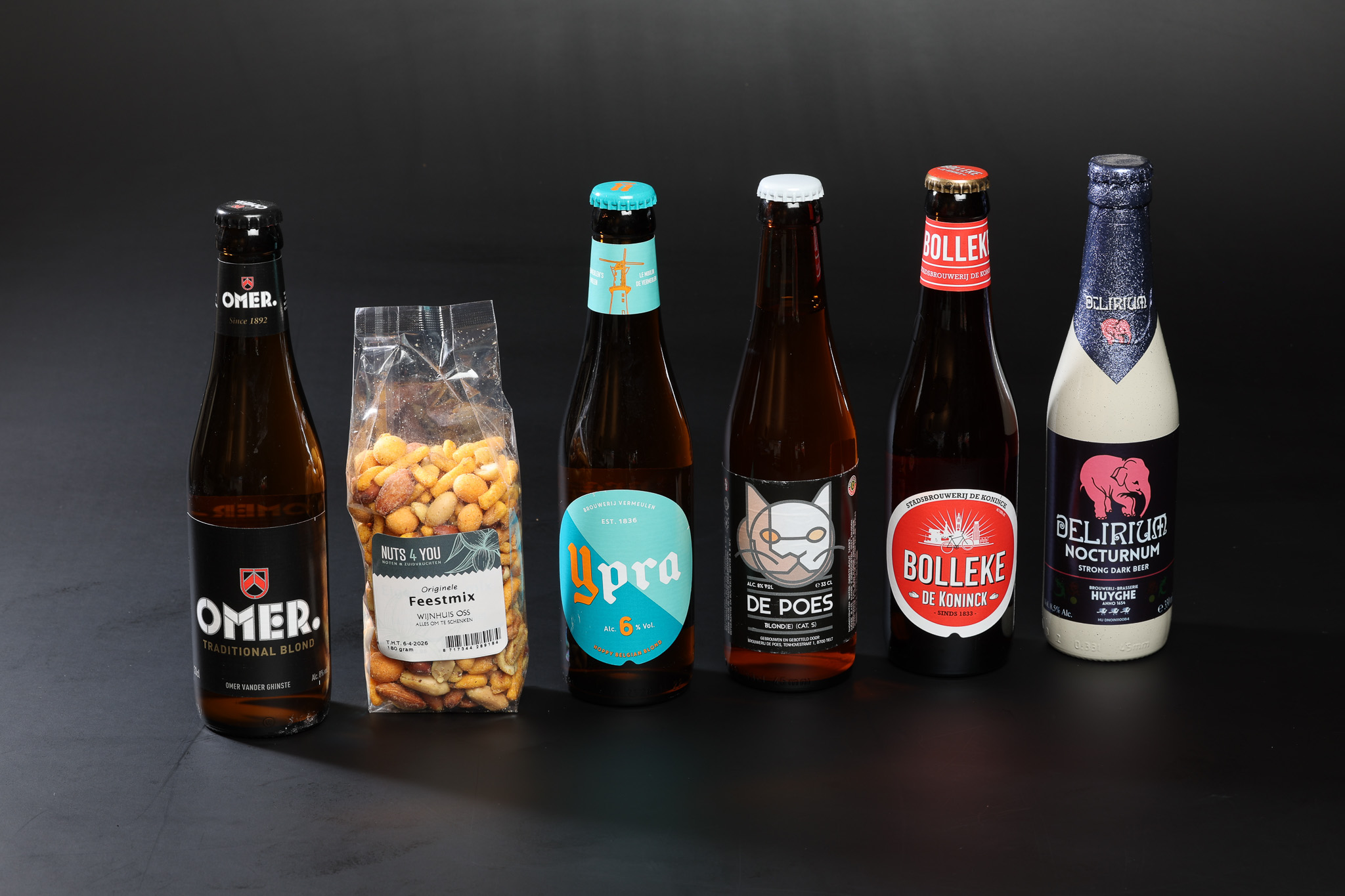 Een leuke cadeauverpakking met daarin vijf verschillende speciaalbieren en een zakje borrelnootjes. De stijlen variëren van witbier tot quadrupel en alles wat daar tussenin zit van streekbieren tot zelfs bieren uit Afrika. Laat u verrassen!
