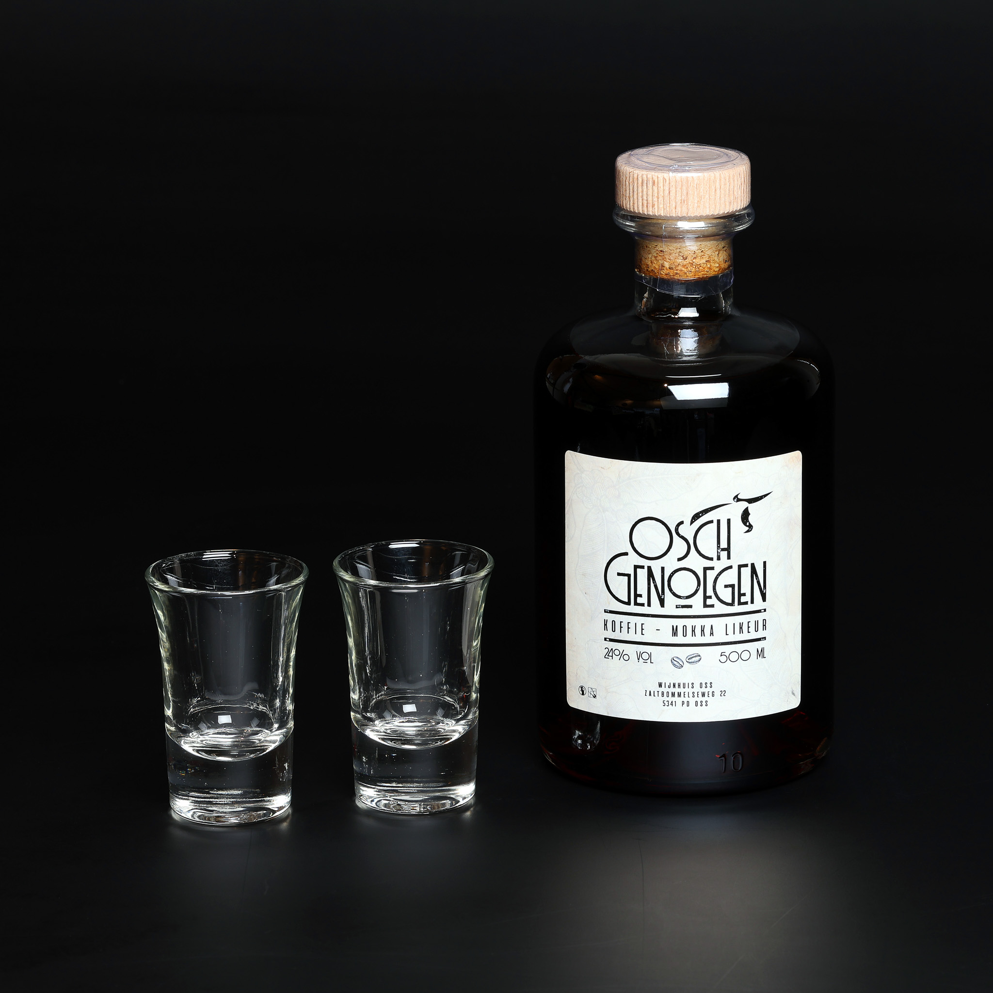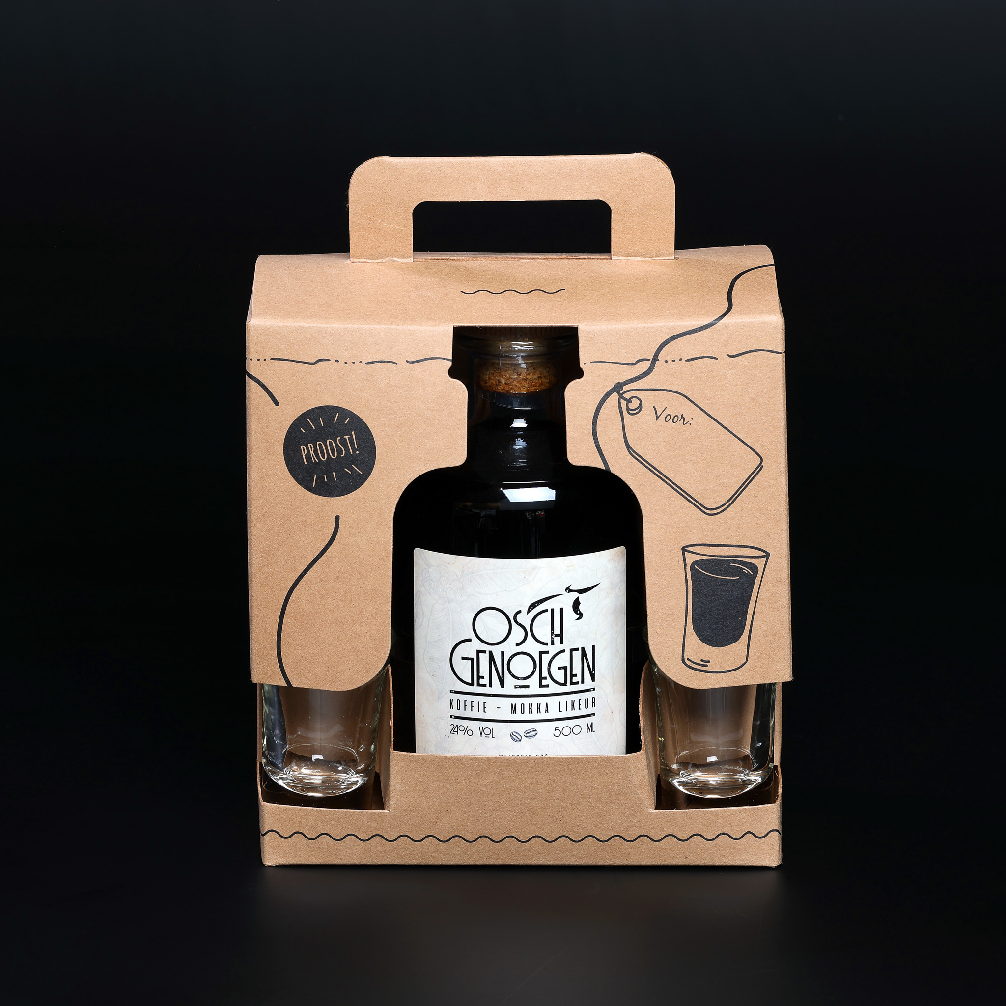 Een cadeau speciaal uit Oss, dat is nog eens een leuk geschenk. In de verpakking zitten 2 borrelglaasjes met de Osch Genoegen Koffie- Mokka likeur.
