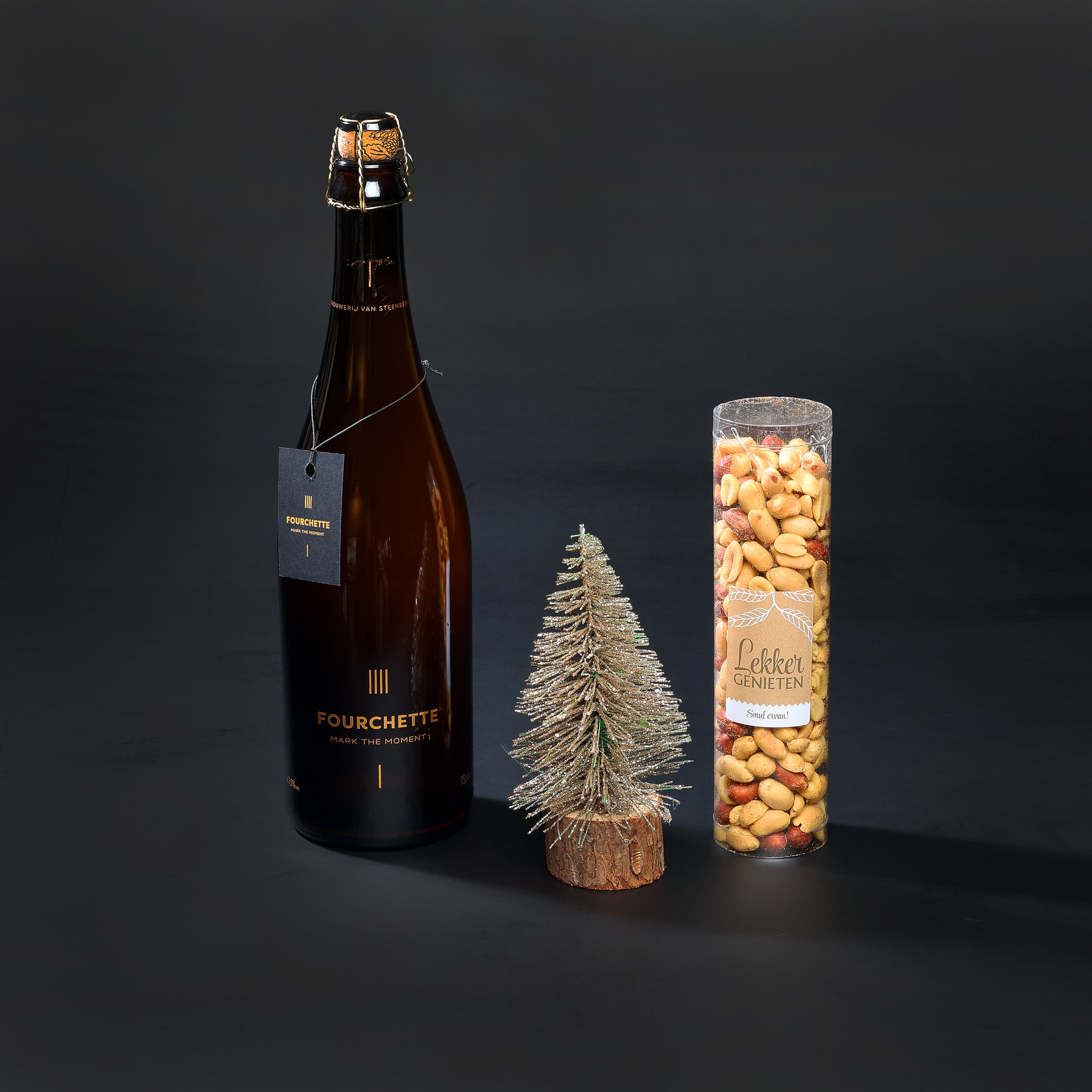 Dit pakket pakken wij sierlijk in met foliezakje, een gouden of zilveren bodem en een feestelijk lint.