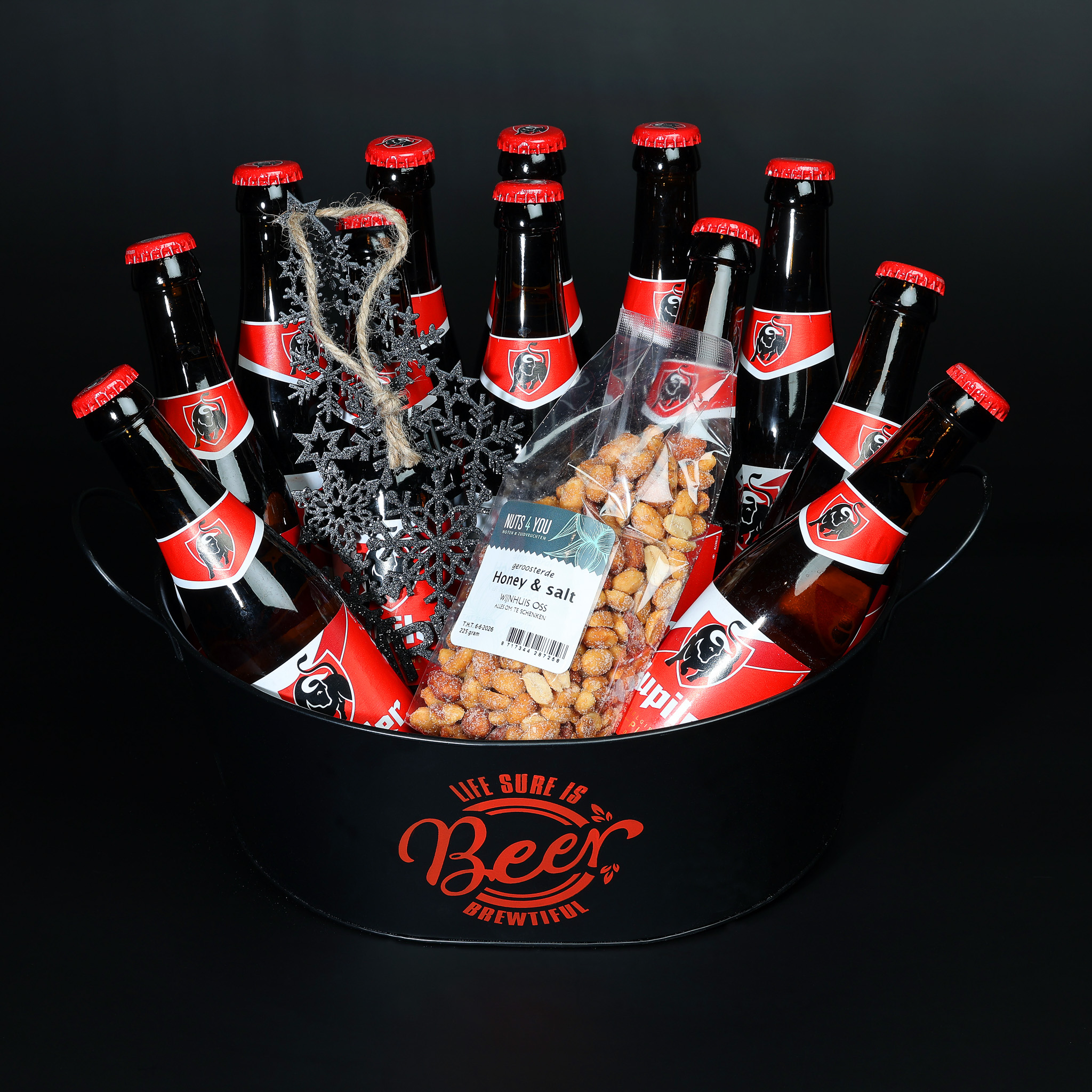 Deze stijlvolle ovale zwarte beerbucket is het perfecte kerstcadeau voor iedere bierliefhebber. De emmer is gevuld met 12 verfrissende flesjes Jupiler (25cl), ideaal om direct koud te zetten of feestelijk te serveren. Om het genieten compleet te maken, bevat het pakket de verrukkelijke Honey & Salt notenmix van Nuts4You, een heerlijke combinatie van zoet en hartig. Als sfeervolle finishing touch is er een elegante opengewerkte kerstboom-hanger toegevoegd. Perfect om de kerststemming in huis te halen.