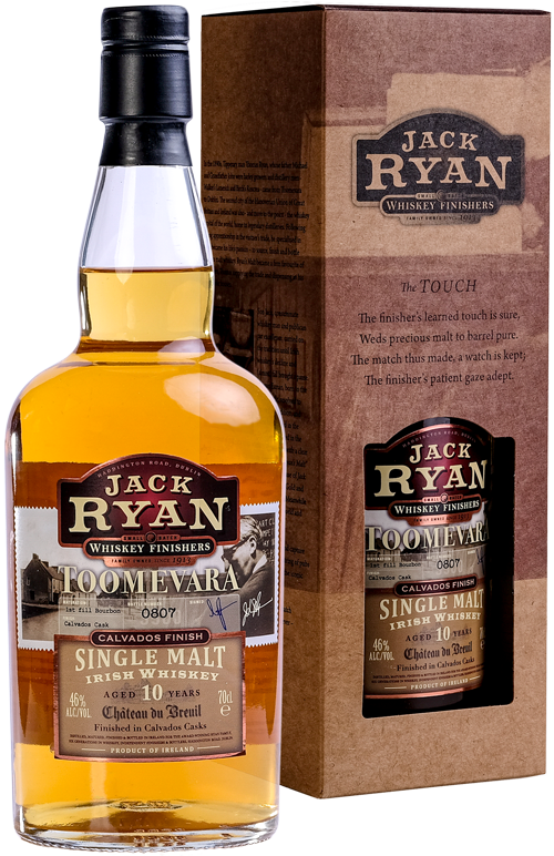 Jack Ryan Toomevara 10 Year Old is een uitzonderlijke Ierse single malt whisky, geproduceerd door de Jack Ryan Whiskey Company. Deze expressie maakt deel uit van de ‘Generation Trilogy’ en is een eerbetoon aan de rijke geschiedenis van de Ryan-familie in de whiskyindustrie. De whisky heeft 10 jaar gerijpt in ex-bourbonvaten en heeft vervolgens een extra rijping ondergaan in Calvados-vaten van Château du Breuil in Normandië, Frankrijk. Deze unieke afwerking voegt een extra laag van complexiteit en fruitigheid toe aan het smaakprofiel. In de neus biedt deze whisky drie nuances van appel: de warme geur van gestoofde appels, het zure karakter van groene appelgummies en de frisse tonen van verse groene appels. Deze aroma’s worden aangevuld met hints van sap, vers gemaaid gras en sinaasappelroom. Met toevoeging van een beetje honing evolueren deze geuren naar een combinatie van grasachtige en romige tonen, met een vleugje sinaasappelschil.