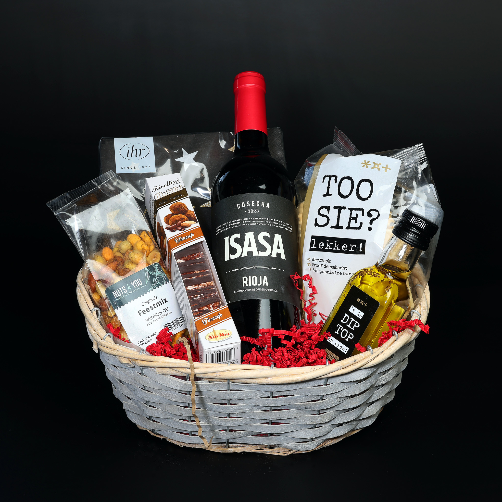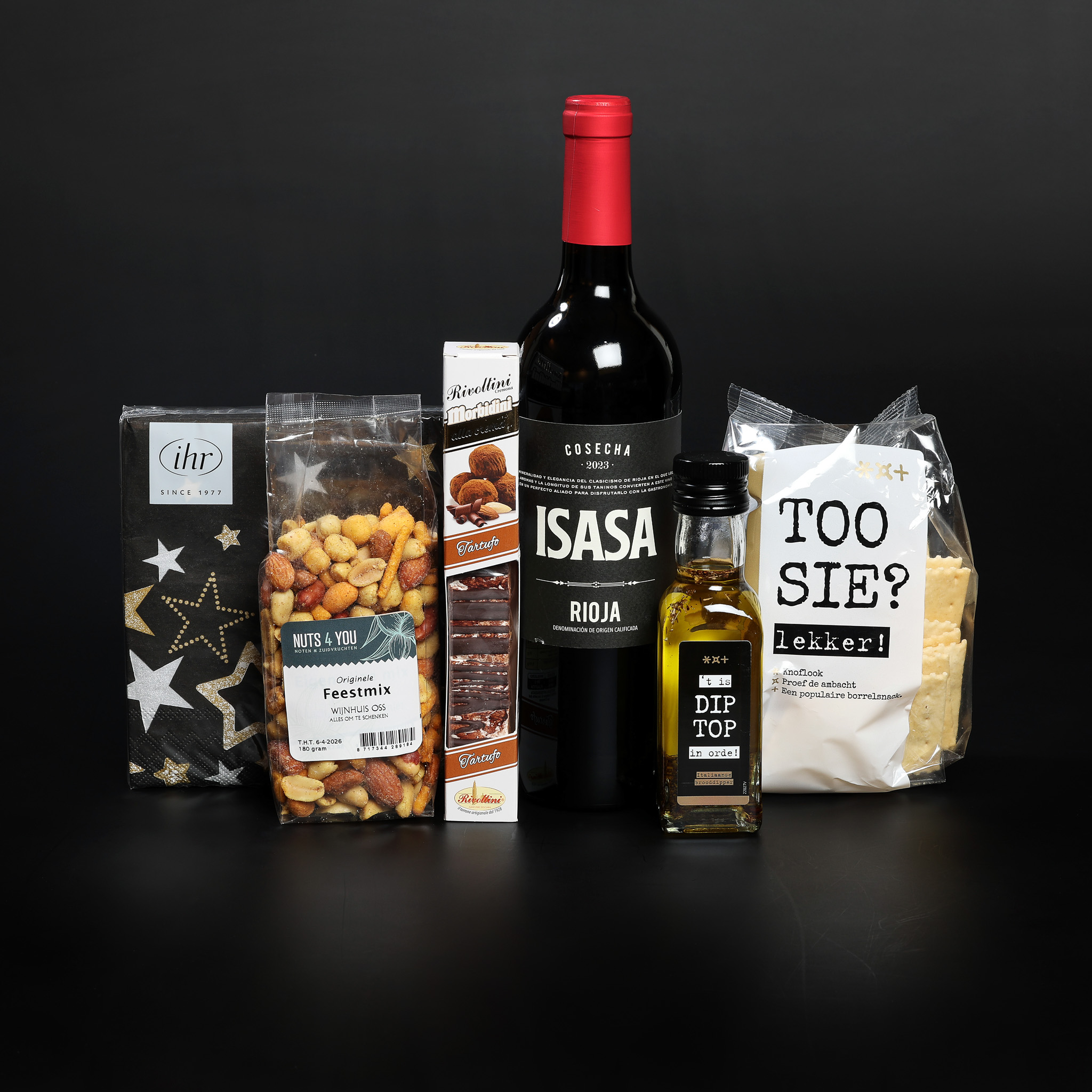 Breng sfeer aan de feesttafel met dit kerstpakket vol smaak en gezelligheid. Geniet van een volle Spaanse Rioja, knapperige borrelhapjes, romige truffelchocolade en een verfijnde olijfolie. Een perfect cadeau om samen van te proeven, vol warmte luxe en feestelijke gezelligheid.