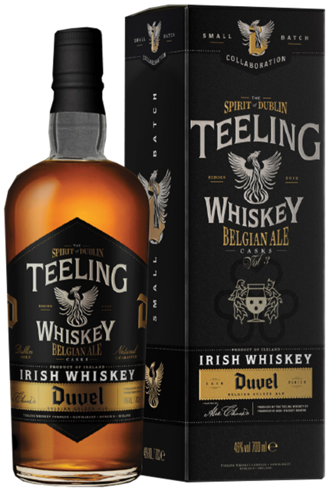 Teeling Duvel Collaboration Batch 3 is een unieke Ierse whisky die voortkomt uit een samenwerking tussen de Teeling Distillery en de Belgische brouwerij Duvel Moortgat. Deze derde editie bouwt voort op het succesvolle vatwisselingsproces, waarbij eikenhouten vaten eerst zijn gebruikt voor het rijpen van Teeling-whisky, vervolgens voor de creatie van Duvel Barrel Aged Batch 7, en daarna opnieuw zijn gevuld met Teeling-whisky. Dit proces resulteert in een whisky met een verfijnde, afgeronde smaak. In de neus biedt deze whisky een intrigerende mix van citrus, groene appel en kruidige tonen afkomstig van de Duvel-vaten, gecombineerd met hints van vanille en honing. Het smaakpalet onthult een zachte, romige textuur met tonen van mout, geroosterde noten en de zoete invloeden van het ex-rumvat. Het bierkarakter voegt een vleugje hoppige bitterheid toe, samen met nuances van karamel en lichte kruiden. De afdronk is middellang en verfrissend, met een mooie balans tussen zoetheid, mout en een subtiele bittere noot. Met een alcoholpercentage van 46% wordt deze whisky non-chill filtered gebotteld, wat zorgt voor een rijke en authentieke smaakervaring. Deze exclusieve editie is een must-have voor zowel whisky- als bierliefhebbers die de harmonie van Ierse en Belgische ambachtelijkheid in elke slok willen proeven.