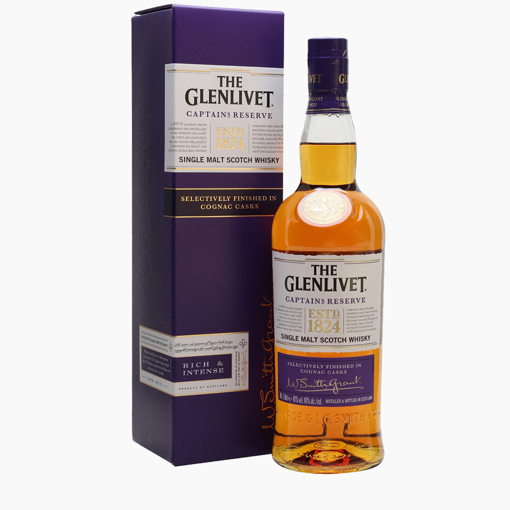 Glenlivet Captain’s Reserve is een bijzondere single malt whisky die het klassieke Speyside-karakter van Glenlivet combineert met de rijke, fruitige invloeden van Cognac-vaten. Deze expressie is geïnspireerd door het avontuurlijke leven van Captain William Smith Grant, een directe afstammeling van de oprichter van de distilleerderij, en biedt een unieke, gedurfde smaakervaring. Na rijping in traditionele eiken- en sherryvaten wordt de whisky afgewerkt in hoogwaardige Cognac-vaten, wat zorgt voor een rijke, fruitige complexiteit. In de neus komen diepe aroma’s van rozijnen, gekonfijt fruit, en abrikoos naar voren, ondersteund door subtiele hints van kruiden en karamel. De smaak is vol en rond, met lagen van sappige peren, sinaasappelschil, honing en specerijen, verrijkt met de luxe, fluweelzachte invloed van Cognac. De afdronk is lang en verwarmend, met een aanhoudende zoetheid en een vleugje eikenhout. Glenlivet Captain’s Reserve is een spannende, innovatieve whisky die zowel voor de cognacliefhebber als de whiskydrinker een rijke en verfijnde ervaring biedt.